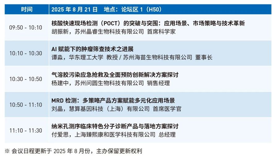 本场论坛聚焦核酸POCT、AI肿瘤筛查、MRD检测、气溶胶防控与纳米孔测序等多个热门方向,邀请来自产、学、研的多位专家代表展开深入分享,碰撞思想,链接资源。